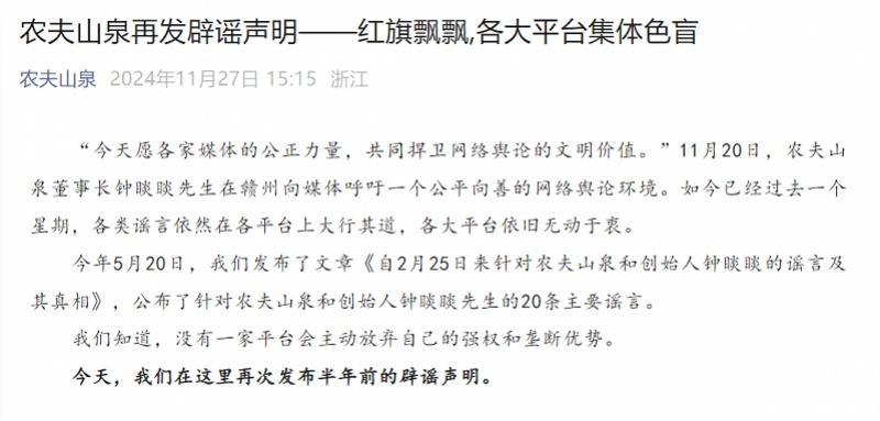 11月27日下昼,农夫山泉再发辟谣声明,文中再次对半年前发布的声明试验进行摆设,包括针对农夫山泉和创举东说念主钟睒睒的20条主要流言及真疏浚晓。