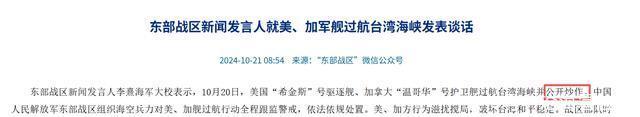 如24年10月份,东部战区就好意思加艨艟过航台海一事默示,好意思、加活动过问搅局,破损台海悠闲。25年2月,东部战区在对加拿大艨艟过航台海通报时也指出,其活动过问搅局,破损台海悠闲。再远少量的如21年10月,好意思加艨艟过航台海时,东部战区默示好意思加勾连寻衅、搅局闹事、性质恶劣,严重危害台海和沉悠闲。