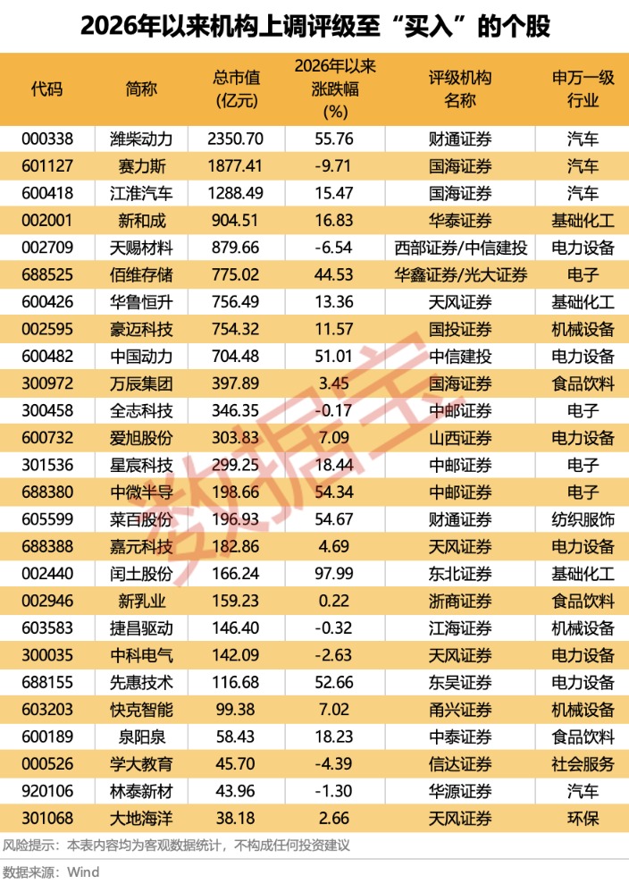 从评级转机情况来看,26股评级赢得机构上调:汽车板块的潍柴能源、赛力斯、江淮汽车、林泰新材,食物饮料板块的万辰集团、新乳业、泉阳泉,电子板块的佰维存储、全志科技、星宸科技、中微半导等均上榜。